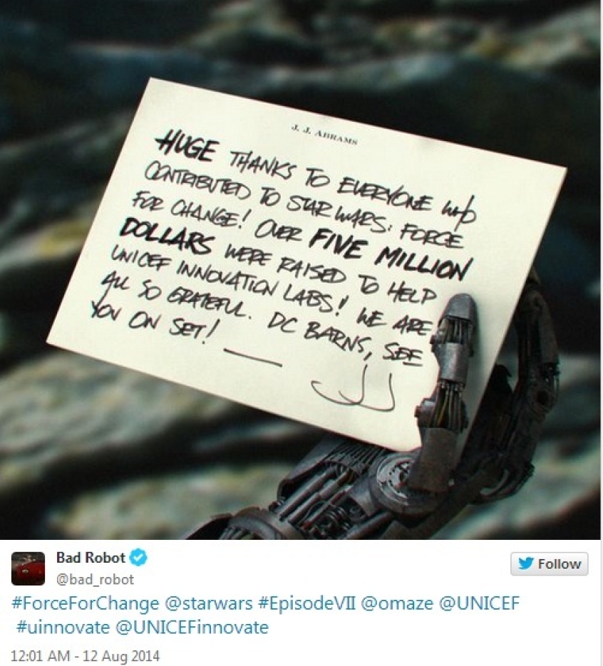 "#ForceForChange @starwars #EpisodeVII @omaze @UNICEF #uinnovate @UNICEFinnovate" @bad_robot