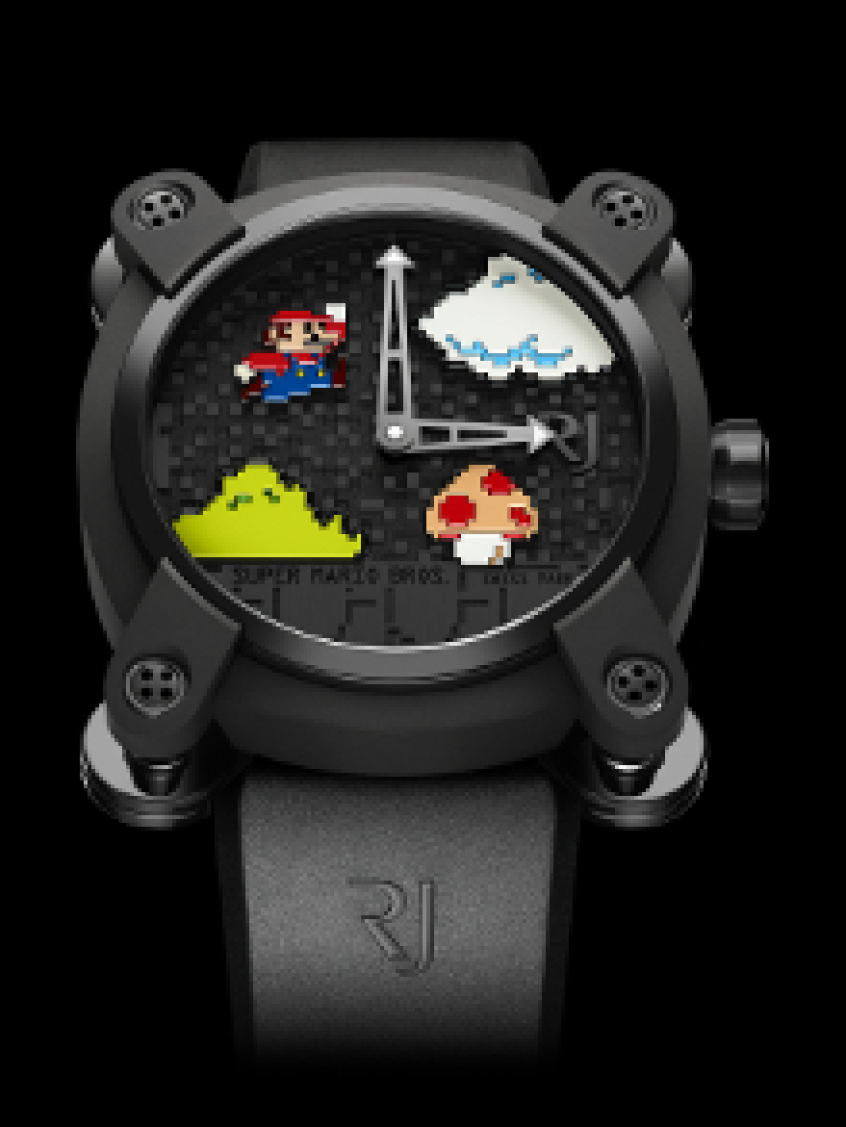 The mechanism is enclosed in a 46-millimeter wide case made from black titanium. The design gives emphasis to the pixelated quality of the game, with Mario in his signature red shirt and blue overalls and the famous mushroom seen on the face of the watch.