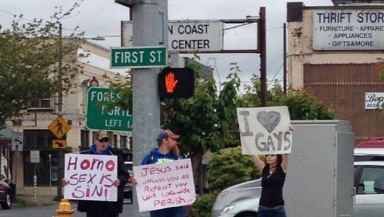 A 16-year-old teenager in Tillamook, Oregon, who held an "I Love Gays" sign alongside two men who were brandishing placards calling homosexuality sin, and calling on people to repent, has now gone further and called on others in her town to join her counter-protest.