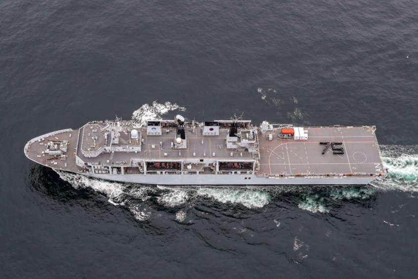 Officers on the Royal Navy's flagship HMS Albion formed a giant number '75' on the flight deck to commemorate the 75th anniversary of D-Day on Wednesday.