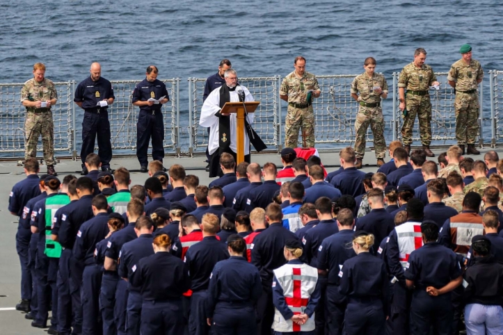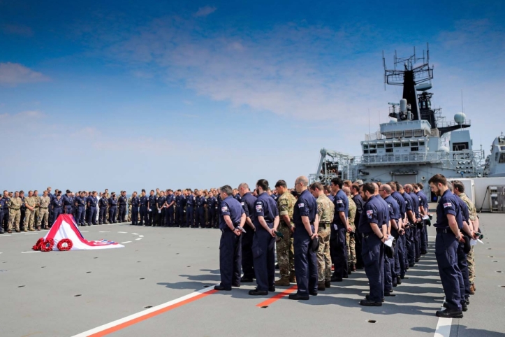 More than 500 personnel from the Royal Navy, Royal Marines, soldiers and airmen gathered on the flight deck for the service of thanksgiving and remembrance led by the ship's chaplain, the Rev Eddie Wills.