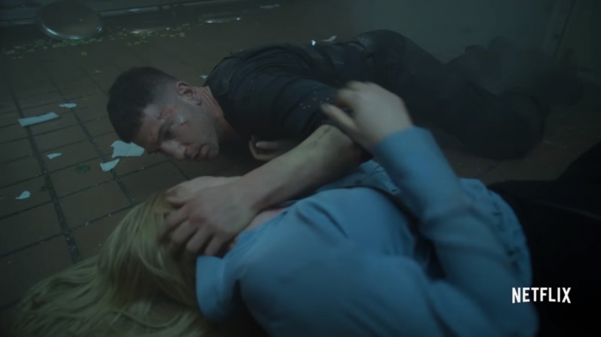 Screengrab from the trailer of "The Punisher" hints at a romantic relationship between "Daredevil's" Karen Page and Frank Castle, a.k.a. The Punisher. YouTube/Netflix