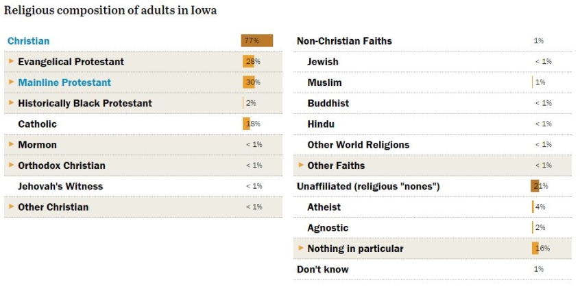 Iowa's 77 per cent Christian population and heavy evangelical presence is a big factor. FiveThirtyEight has Trump at 68 per cent here.