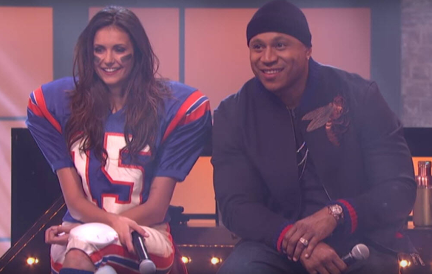 The 6-foot-3-inch football free agent then takes off his jacket, as rival, "Vampire Diaries'" Nina Dobrev in a jersey, and show host LL Cool J cheered in amazement. He then continues with his jabs in the air, showing off those muscles.