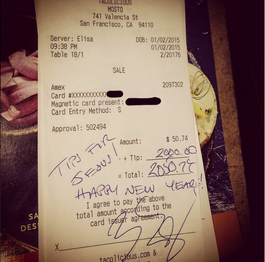On January 2, employees of Tacolicious in the Mission District were stunned to see that someone had left them a $2,000 tip on a $50.74 tab, with the message "Tips for Jesus" and "Happy New Year" written on the bill.