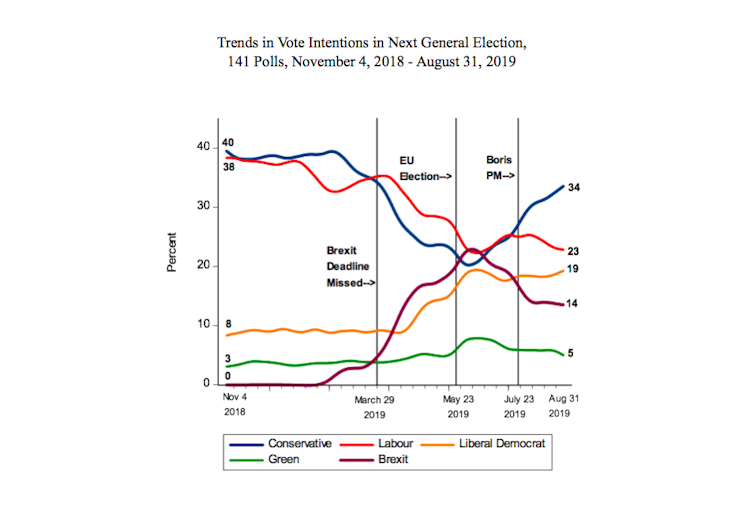 This lack of trust in the prime minister to deliver a no-deal Brexit puts him in a tricky situation – he needs most of the Brexit Party supporters to produce a no-deal outcome. Given his insistence that he is still seeking a deal with Brussels, Johnson is unlikely to win Brexit Party voters until there is actually a no-deal Brexit.