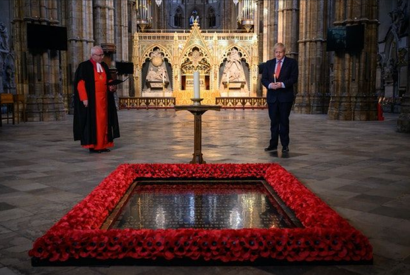 Prime Minister Boris Johnson paid a solemn candle-lit tribute to the fallen at the Grave of the Unknown Warrior in Westminster Abbey on Thursday night.
