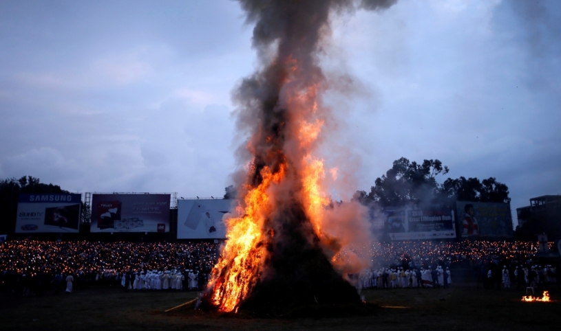 Tens of thousands of Ethiopian Christians lit a large bonfire and processed holding torches through the capital city of Addis Abada, forcing the city to a standstill. This is based on the belief that Helena prayed to find Jesus' cross and was given a revelation in a dream.