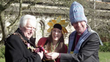 Bishop Holbrook, who has promised to wear the items in future, was joined in his "yarn bombing" experience by the Mayor of Peterborough, George Simons, and Sophie Antonelli from the Peterborough Green Back Yard community garden, who also received woollen gifts.