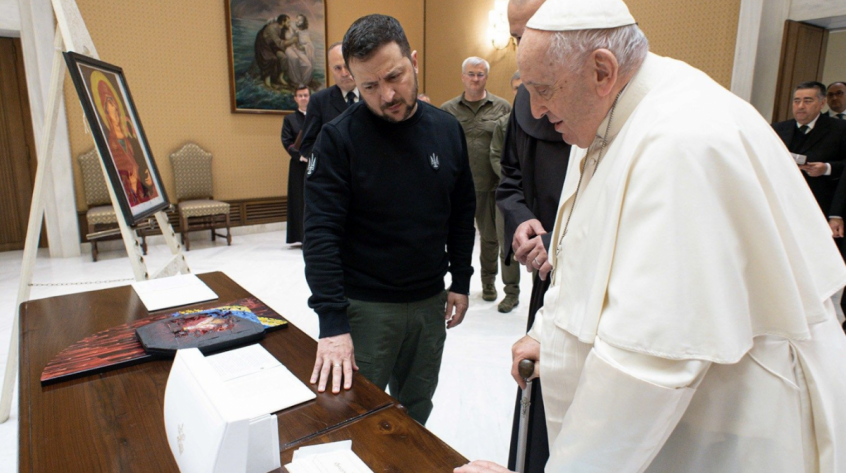 The Pope and Zelensky exchanged gifts, with the Ukrainian president receiving a bronze sculpture of an olive branch representing peace.