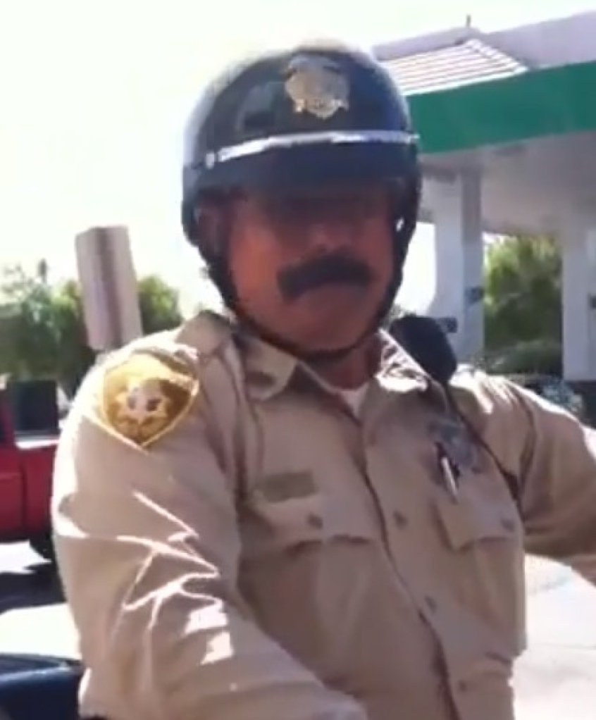 A 12-year-old has called out a cop and demanded his identification number after he spotted him parking illegally. The wayward police officer was video-taped by Jeremy, who was shocked to see him pulling up his motorcycle onto the sidewalk to buy a soda in Las Vegas.