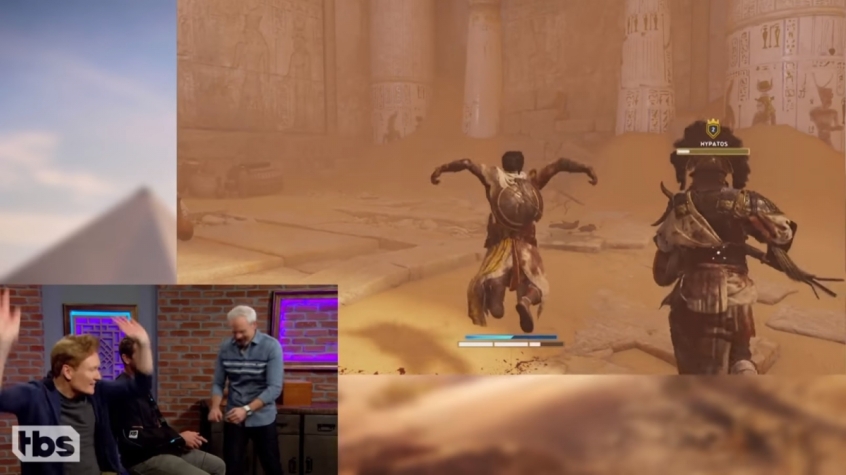 Conan and Rodgers having fun with "Assassin's Creed: Origins'" hidden developer "God mode." YouTube/Team Coco