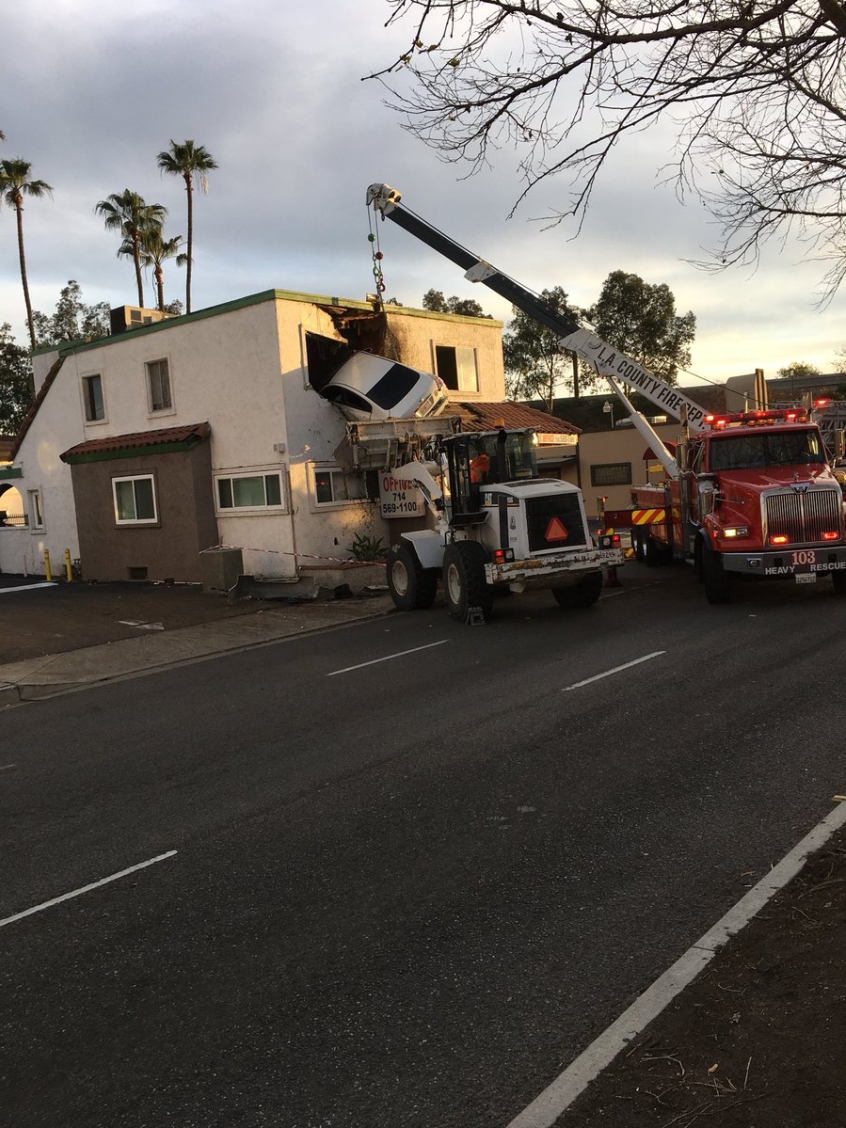 According to reports, the officers were dispatched to the location of the accident at 5:25 in the morning. One of the victims was trapped until 6:45. The OCFA crews and the Los Angeles County Urban Search & Rescue teams worked to remove the vehicle from the building.