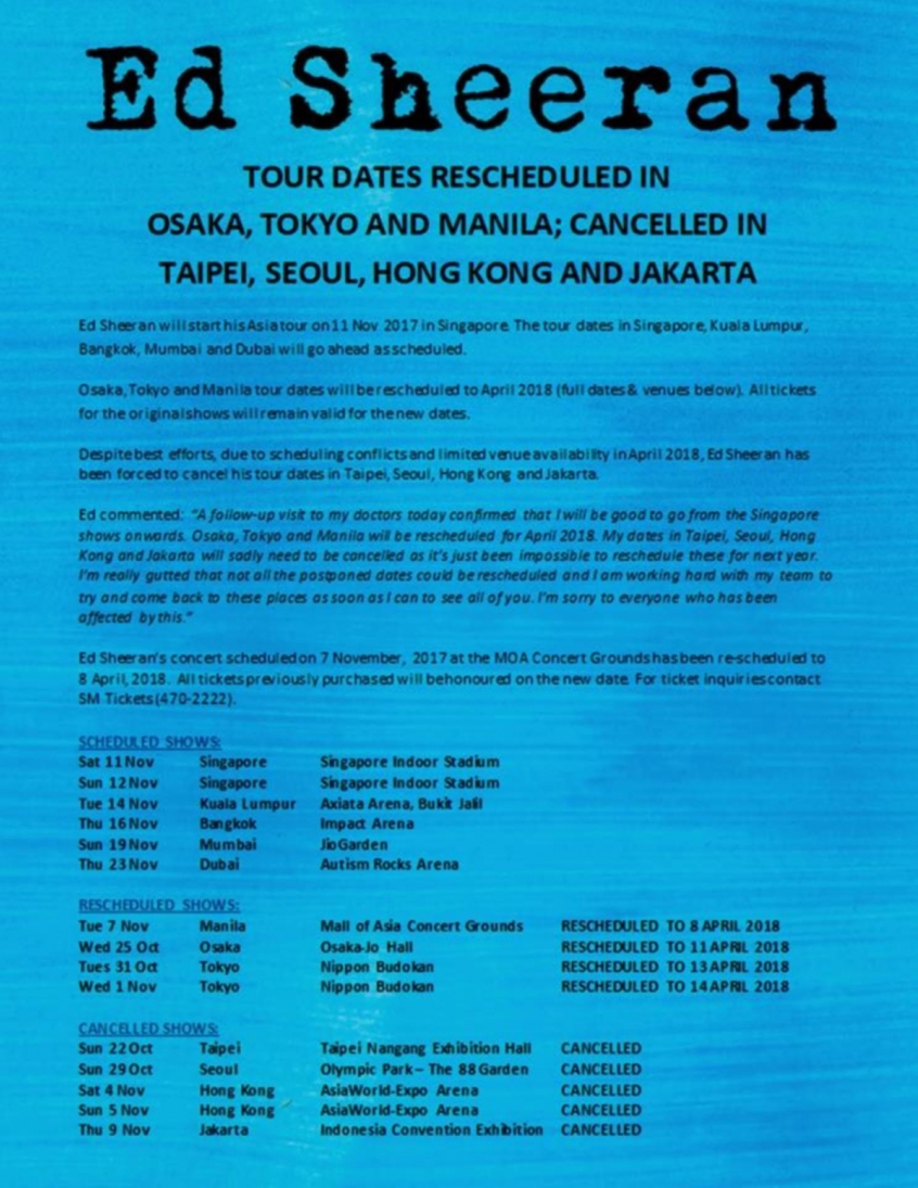 His shows in Taipei, Seoul, Hong Kong, and Jakarta have been cancelled. Some concerts set in 2018 were rescheduled, including performances in Singapore, Manila, Osaka, and Tokyo. Due to complications with the dates, some of the shows had to be cancelled. In a statement released by Ovation Productions, Sheeran said, "I'm really gutted that not all the postponed dates could be rescheduled and I am working hard with my team to try and come back to these places as soon as I can to see all of you. I'm sorry to everyone who has been affected by this."