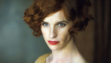 A recently released photo of Redmayne as Elbe features the actor wearing a red, curly-haired wig, eyeliner, mascara, and red lipstick.