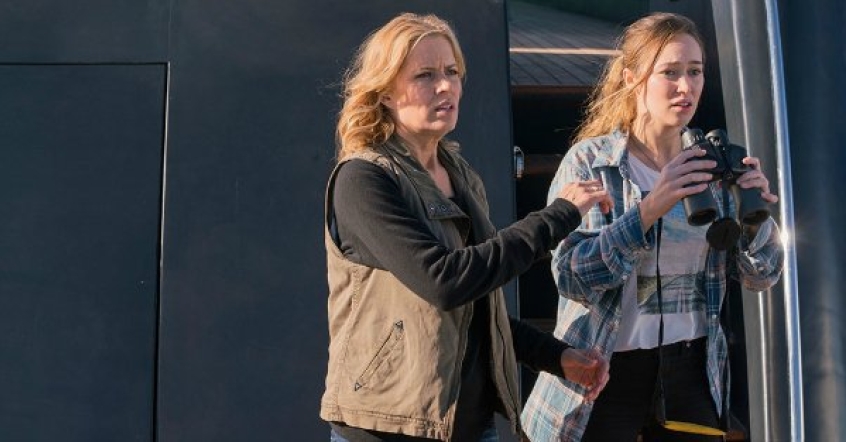However, just because the characters will survive the journey to the yacht doesn't mean they are entirely free from trouble. Another image reveals Alicia holding a pair of binoculars as she and her mother Madison (Kim Dickens) are looking at something in the waters.