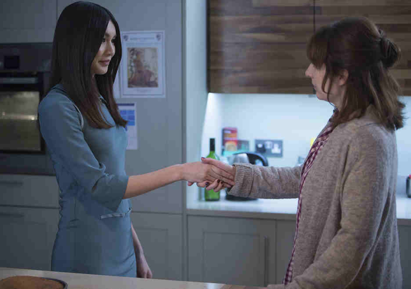Laura (right) decides to let Anita stay after she saves her son's life, on Humans AMC/ Humans