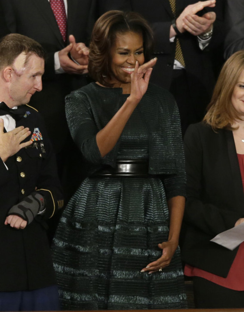 The First Lady of the United States Michelle Obama wore a forest green Azzedine Alaia dress for the annual State of the Union address tonight.