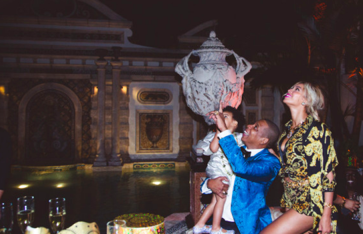 Another photo not related to the party shows the whole family together, with Jay-Z holding Blue Ivy with Beyonce standing next to pair and looking up at something in the sky.