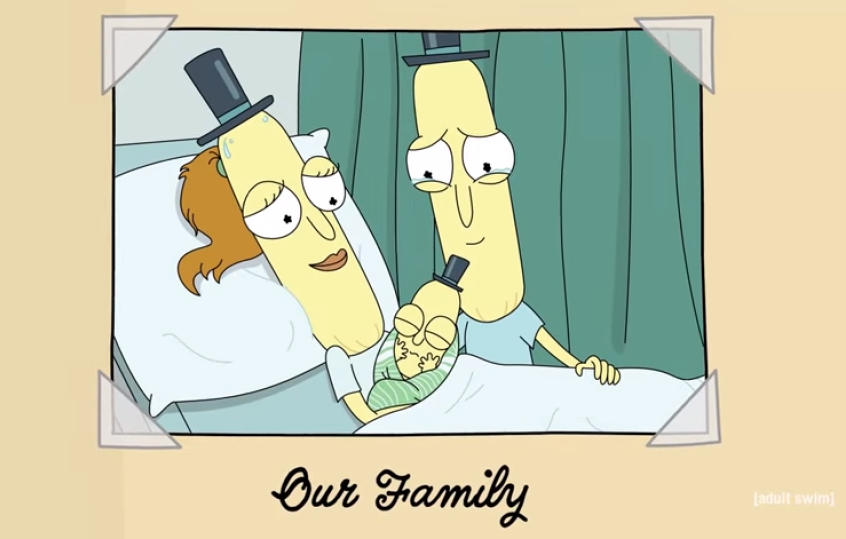 The montage ends with Mr. Poopybutthole wandering into the kitchen to smile at his wife and son.