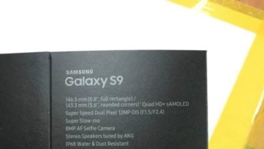 Based on the box, the Galaxy S9 will come with a 5.8inch full rectangle screen, much like its predecessor. It also comes with a "Super Speed" 12 mega-pixel camera with a "Super Slow-Mo" function. It will also have a built-in storage of 64 gigabytes (GB)
