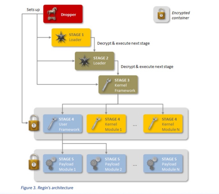 Regin, according to the company, has a six-stage architecture, and the only stage that appears as visible code is stage 1. Stage 0 (dropper) involves the installation of the malware into the target computer; stages 1 and 2 are for loading the drivers; stage 3 loads other components, such as compression, encryption, networking, and handling of EVFS (encrypted virtual file system); stage 4 involves utilization of the EVFS as well as loading other drivers and payloads; then stage 5 is for main payloads and data files.