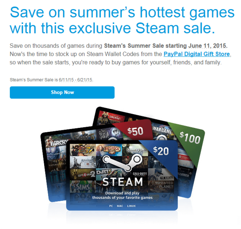A promo sent by PayPal to several individuals confirms the rumored schedule of Valve's Steam Summer Sale 2015, scheduled to start this week. Based on the letter sent by the online payment service, the sale period for a wide variety of PC game titles will begin on Thursday, June 11. It will last until Sunday, June 21. It is almost similar to the report from the Russian gaming site, saying that the Steam Sale will start on June 11, with a "Sale Encore" from June 20 to 22.