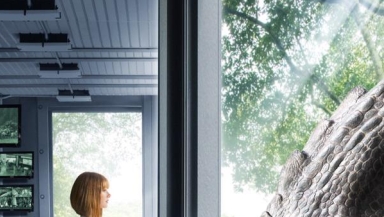 The first photo shows the Indominus Rex peeking into the office of its creator Claire Dearing, who shows no sign of fear of her deadly and ravenous creation. As she looks on face to face with the gargantuan creature, her face is just completely blank.