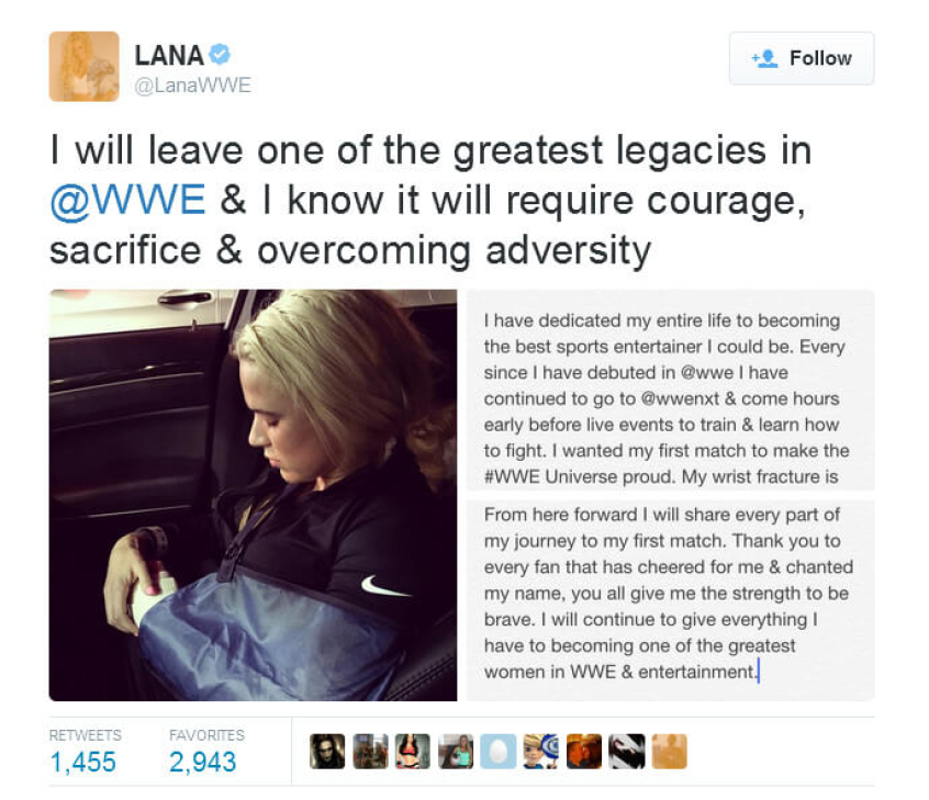 Lana suffered an unfortunate hand injury while working out in the ring for a live event. It turns out that Lana had a deformed wrist which was later on diagnosed as a Colles' fracture.